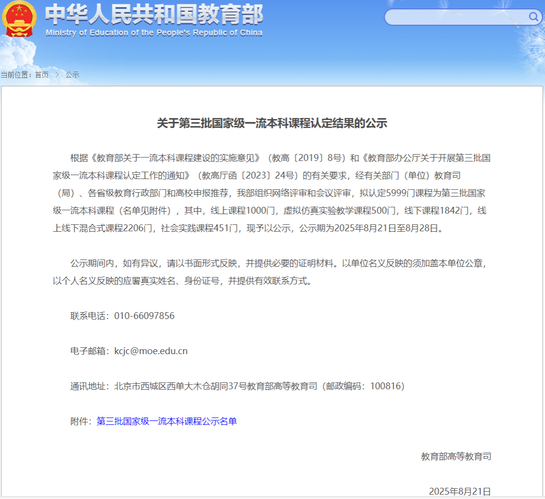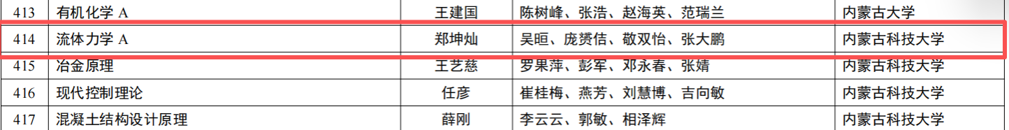 8月21日,教育部公布了《关于第三批国家级一流本科课程认定结果的公示》,我集团郑坤灿教授负责的《流体力学A》课程被认定为“国家级线下一流本科课程”,这是学院“十四五”期间在国家级本科课程建设方面取得的重大突破,为学院教学改革和发展注入强劲动力。